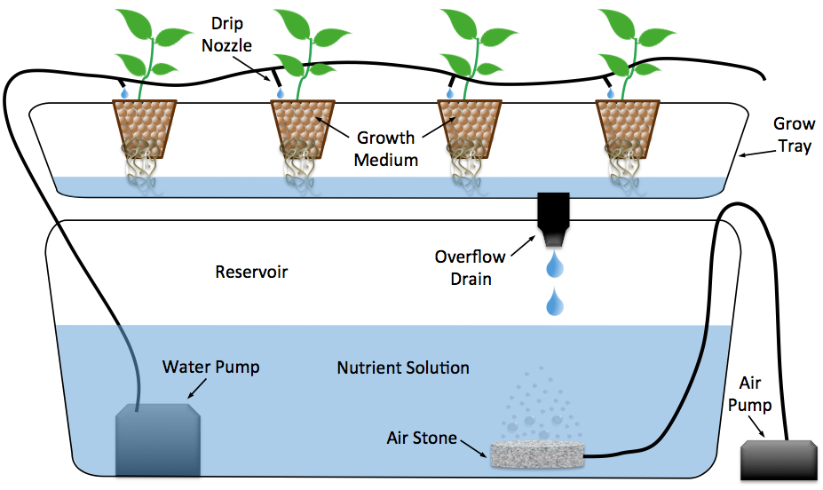 Drip systems are another common and simple technique whereby a pump on a timer delivers a slow feed of the solution to the base of each plant individually. The excess solution can be either returned to the reservoir or not collected. It works well with growing mediums with high water retention (i.e. coco coir, peat moss, or rockwool). When the system is working correctly, it is very low maintenance and high output, but the drip lines can get clogged, which results in dried out plants. Synthetic nutrients are the logical choice for these systems because organic materials clog lines much faster.